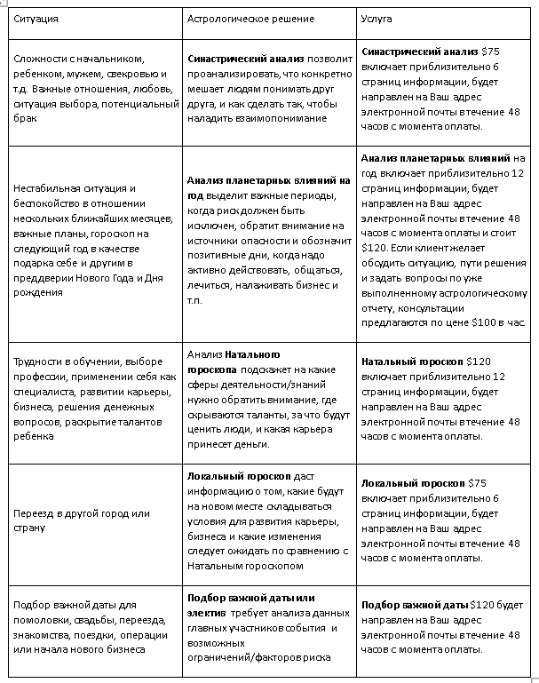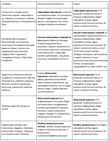 Многие из тех, кто заказывает гороскоп, хотят не только получить планетарную картину, отражающую конкретную ситуацию и спрогнозировать ее развитие, но и узнать о том, как завершить дело с прибылью и успехом или по меньшей мере без убытков и проблем. Астрология может помочь и в этом. Приведенная таблица будет полезна для того, чтобы Выбрать нужную Вам услугу.