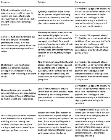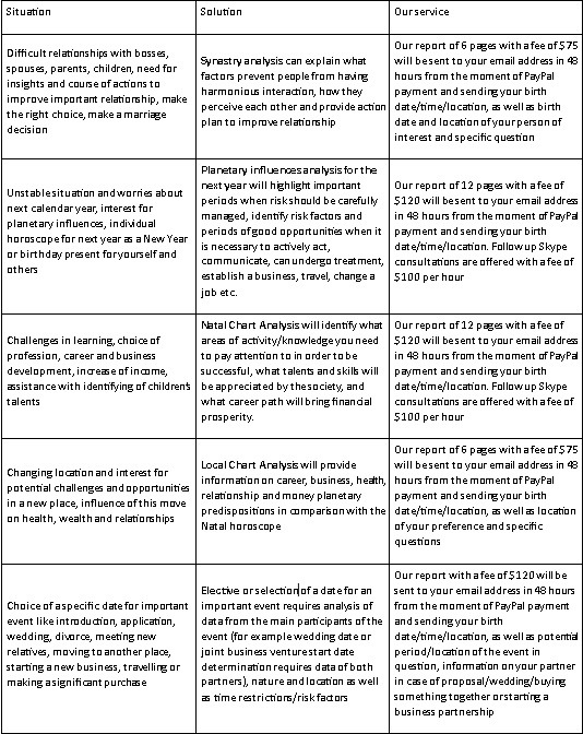 Many of those who order a horoscope want not only to receive a planetary picture that reflects a specific situation and predict its development, but also to learn how to complete the business with profit and success, or at least without losses and problems. Astrology can help with this too. The table below will be helpful in choosing the service you need and you can have a glimpse of what astrology analysis can be consisting of at our Cases page